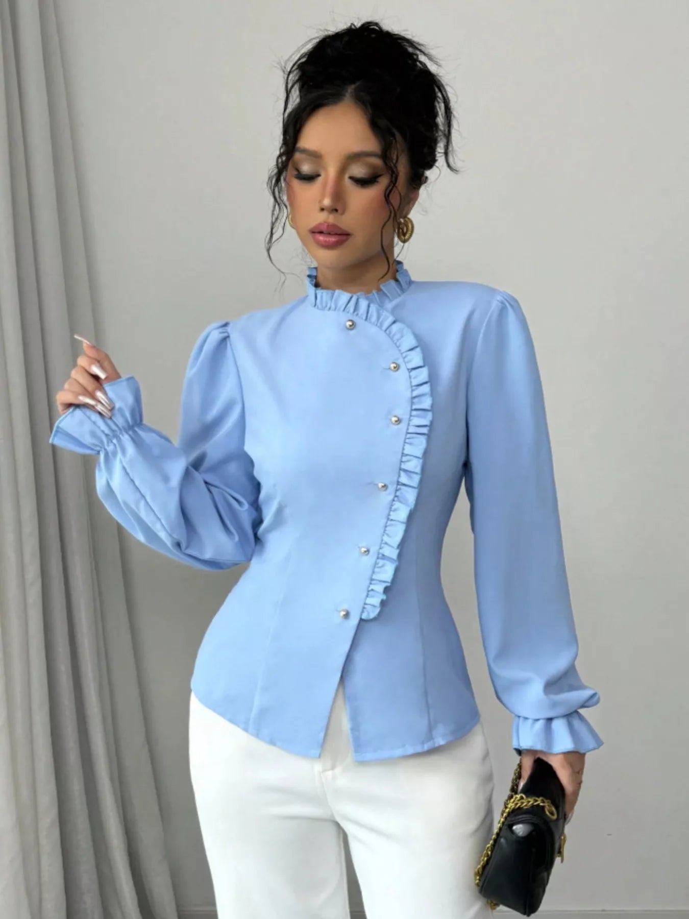 • Features:Buttoned,Ruffled